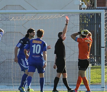 Moments later the match was turned on it’s head up the other end, when South custodian Peter Gavalas collided with Bentleigh’s Ryan De Vries, after the strikers shot had already sailed well and truly over the bar. In what seemed to be an innocuous incident, referee Brenton Hawyward pointed to the penatly spot before sending Gavalas off with a straight red card being produced.